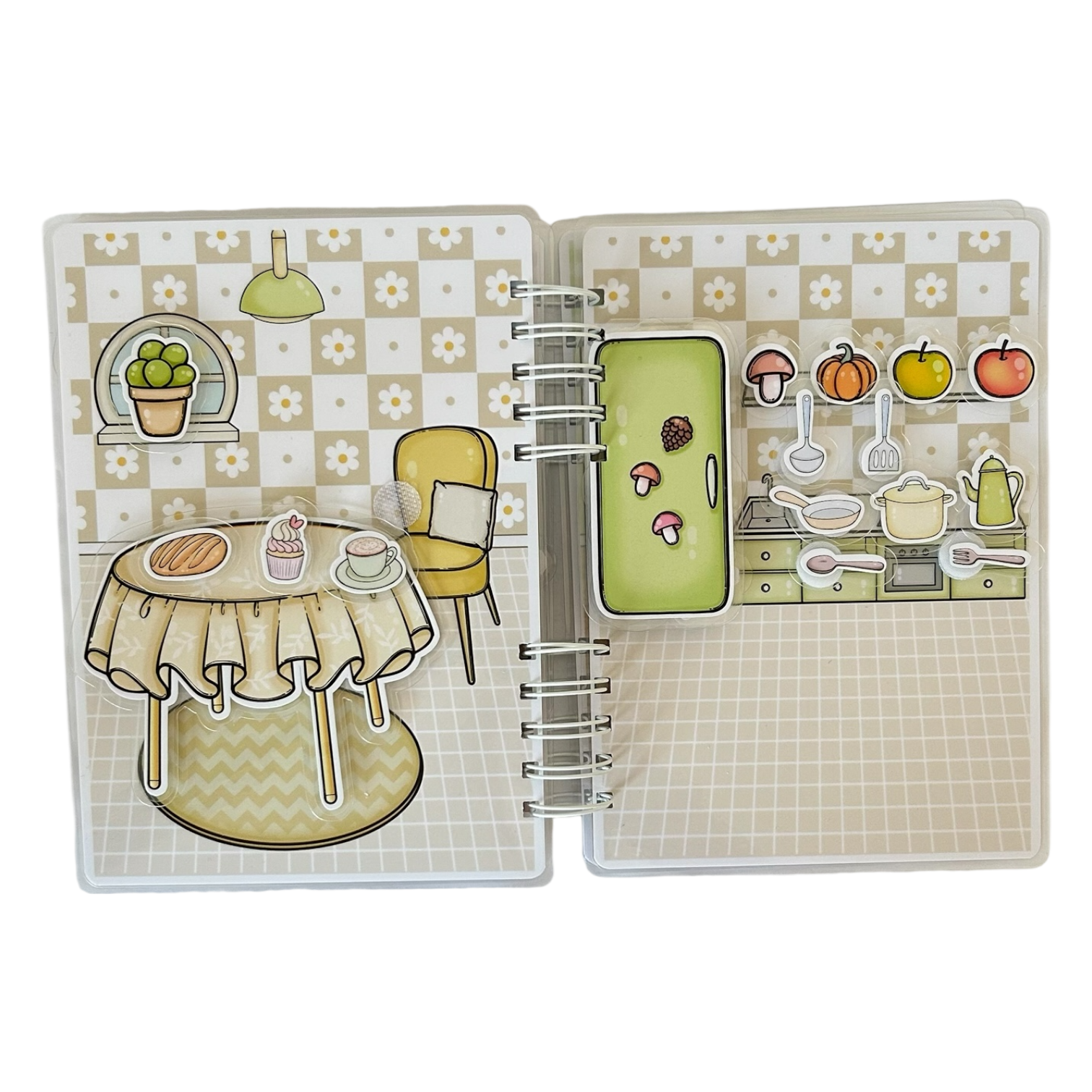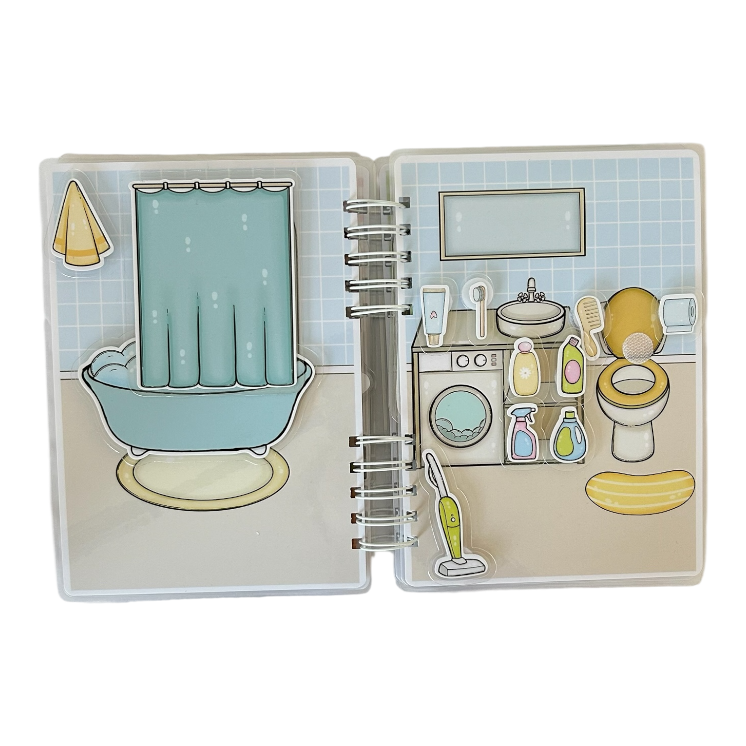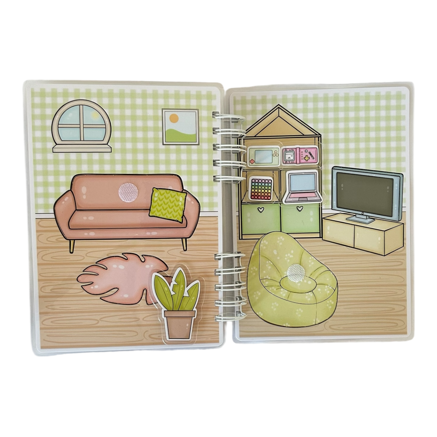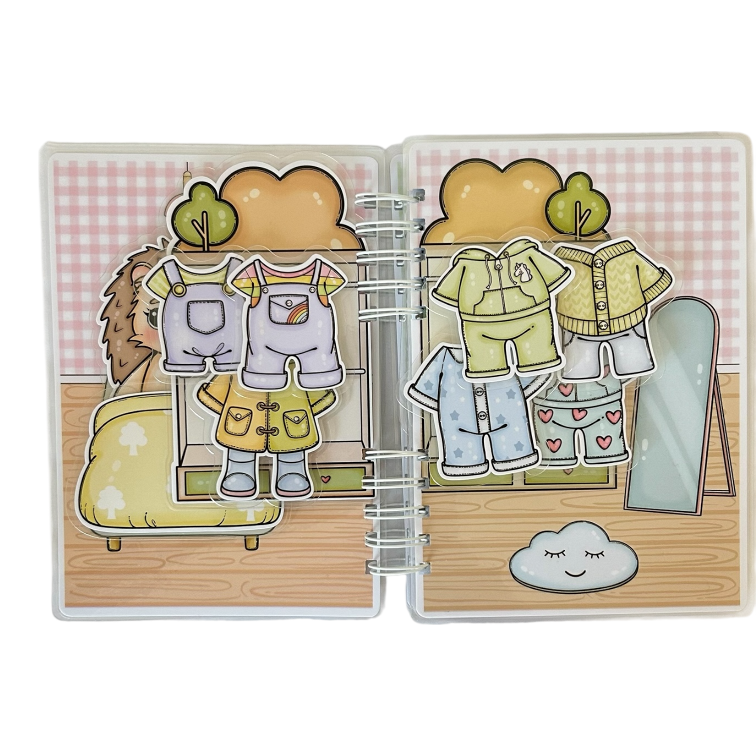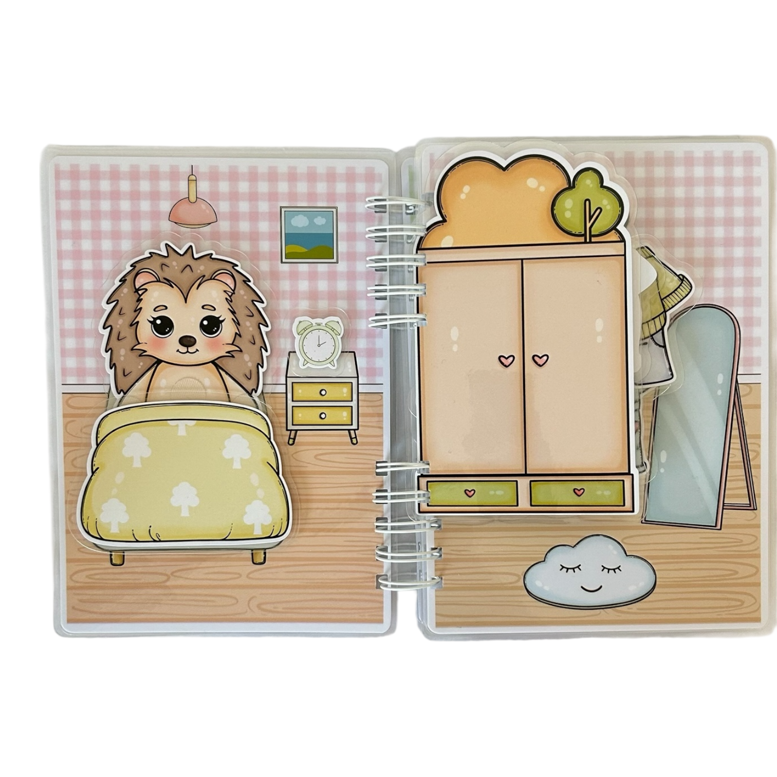 Uvnitř knížky dítě objevuje místnosti ježečkova domečku: ložnici, šatnu, hernu, obývací pokoj, kuchyň, jídelnu a koupelnu. Sada obsahuje 60 dílků na suchý zip, které lze přesouvat a kombinovat, plnit úkoly a vytvářet vlastní herní příběhy.