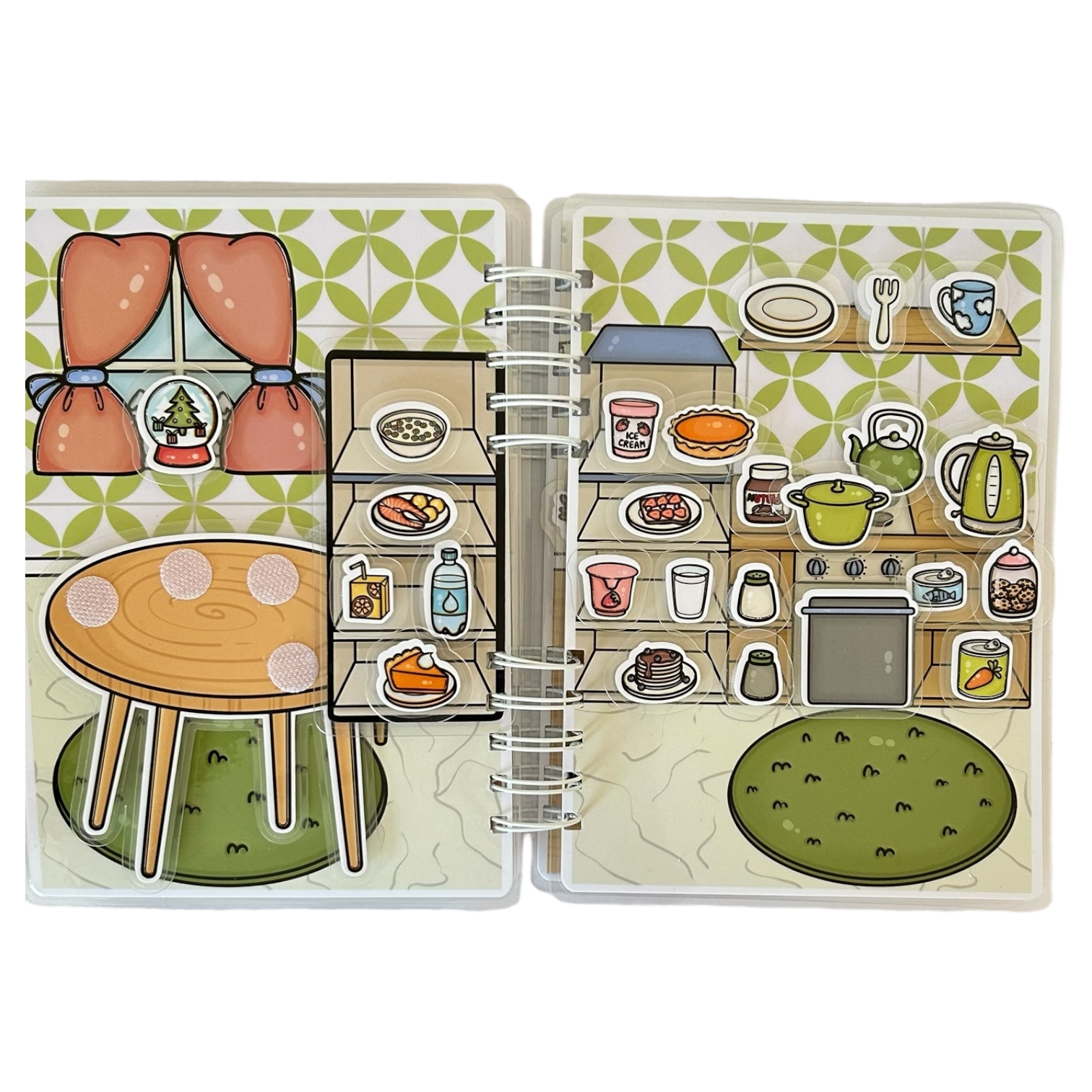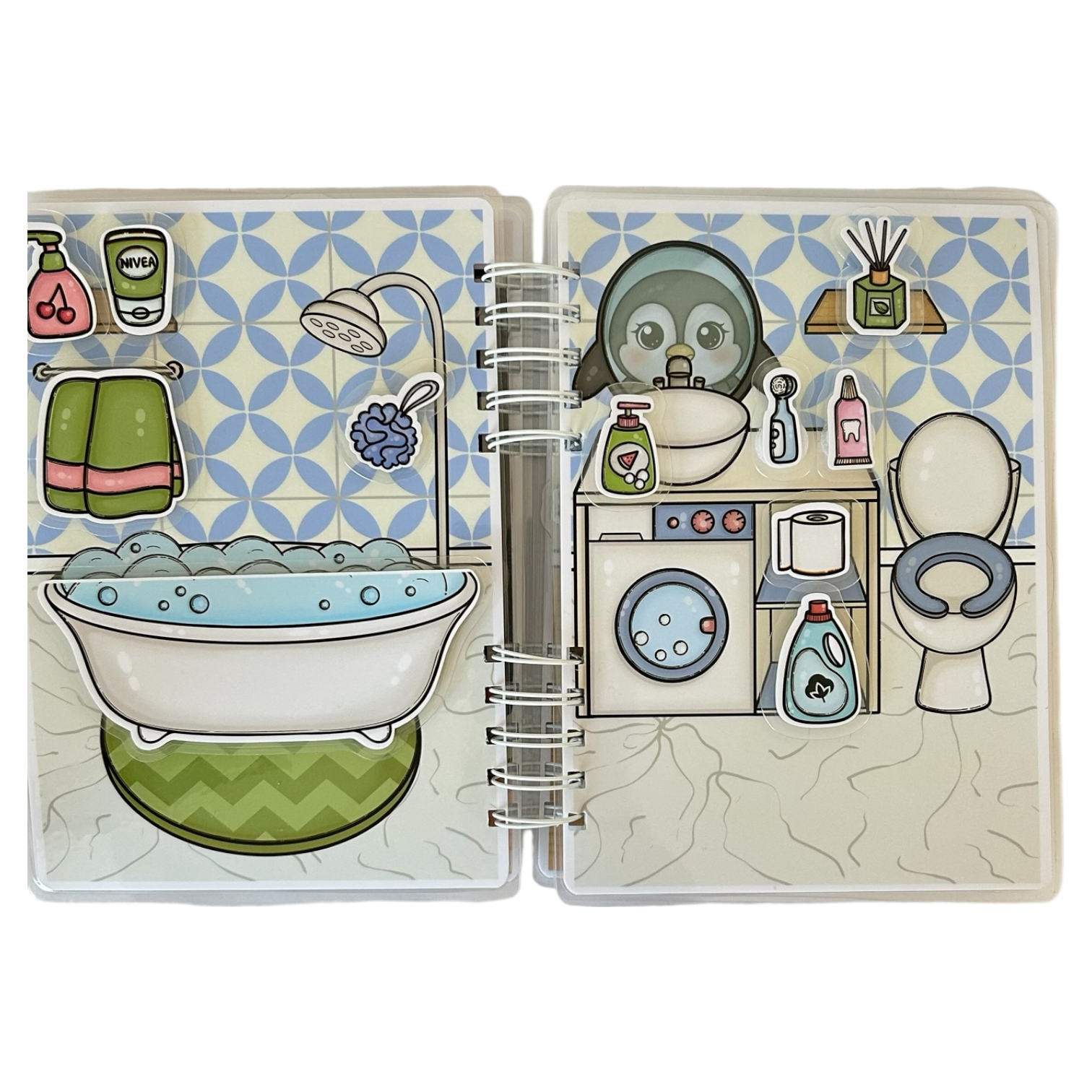 Dítě se v knížce seznamuje s domečkem tučňáka a objevuje jeho místnosti: ložnici se šatnou, koupelnu, kuchyň a obývací pokoj. Sada obsahuje 62 dílků pro příběhové hry, které lze přesouvat, kombinovat a vytvářet s nimi vlastní příběhy. Hra rozvíjí představivost, řeč, logické myšlení, pozornost i jemnou motoriku.