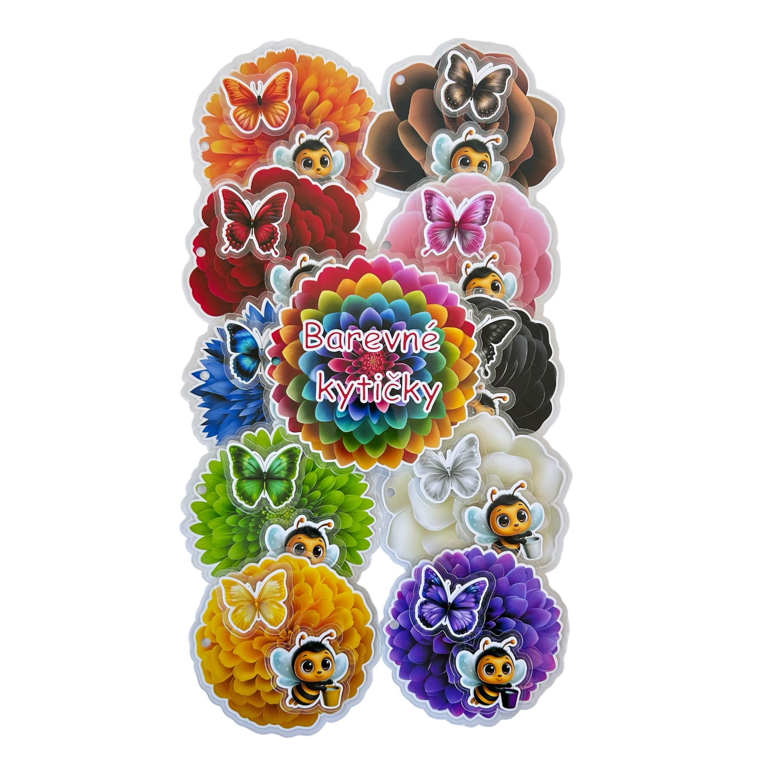 Knížka obsahuje 10 květinových karet různých barev. K každé květině si dítě musí vybrat motýlka, který má stejnou barvu jako květina, a včelku, která má kyblík stejné barvy jako květina. Tímto hravým způsobem si dítě upevňuje znalost barev, učí se je pojmenovávat a zároveň trénuje koordinaci ruky a oka.