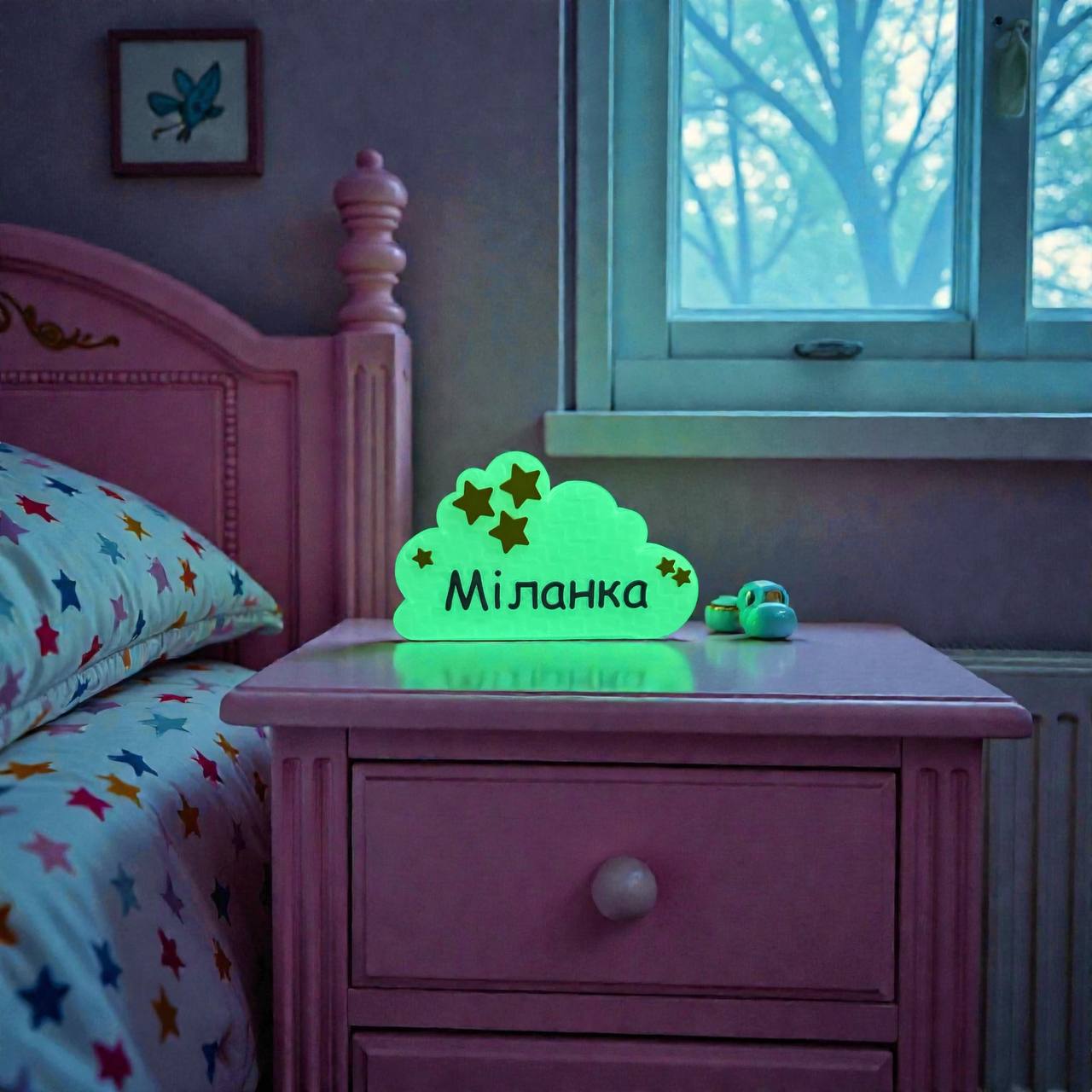 Mráček není jen krásná dekorace do pokoje, ale plní i funkci noční lampičky. Nepotřebuje baterie ani zapojení do zásuvky. Svítí díky luminiscenčnímu plastu, který přes den nasbírá světlo a večer jemně zeleně září.